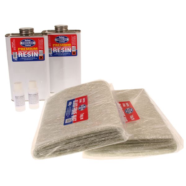 Baileys 2sq.m Premium Fibreglass Repair Kit is ideal for repairing cracks leaks splits and holes in fibreglass GRP. Supplied with 2 x 1kg of high quality Lloyds approved polyester resin and 2 x 1sq.m of 450g chopped strand matting (CSM). The resin has excellent adhesion properties and is widely used for general boat / marine repair & maintenance mould making motorcycle / automotive repairs canoe / kayak repair projects plus many more repair applications. The resin is a high grade low styrene pre-accelerated general purpose laminating / lay-up resin used in 1000's of repair projects. The resin requires MEKP liquid hardener to cure (supplied).