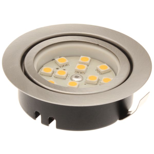 Brushed nickel unswitched recessed downlight. Built in warm white LEDs.