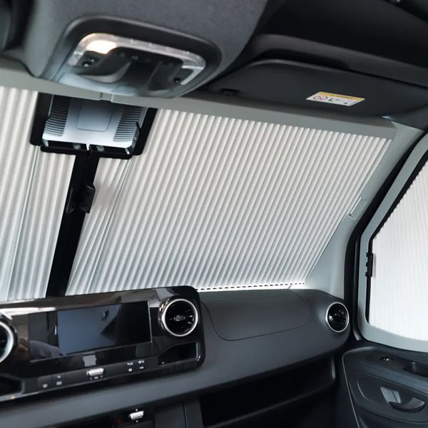 The REMIfront IV cab blackout blinds are designed specifically for Mercedes Benz Sprinter vehicles built from 2024 onwards (models with large rain sensor).