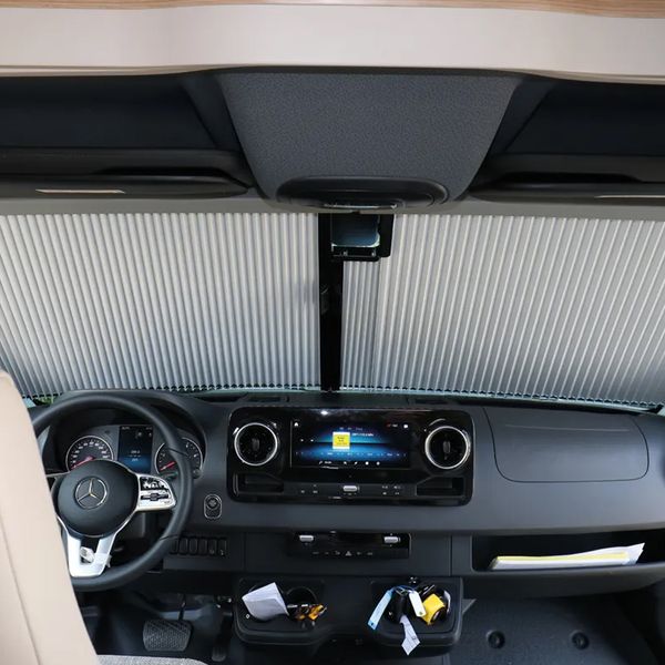 The REMIfront IV cab blackout blinds are designed specifically for Mercedes Benz Sprinter vehicles built from 2024 onwards (models with small rain sensor).