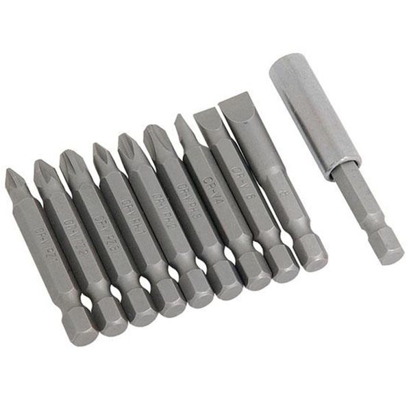 10 piece 50 mm long power bit set in chrome vanadium. Set contains: Flat: 4 mm, 6 mm, 8 mm. Phillips: PH1, PH2, PH3. Pozidrive: PZ1, PZ2, PZ3. Magnetic holder. , Normal Lead Time 2-3 days