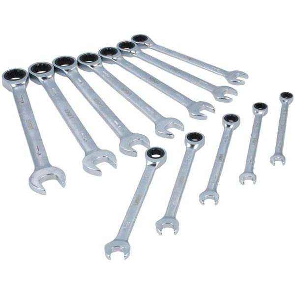 Ratchet ring combination spanner set 8mm to 19mm, with Bi-Hex (12pt) ratchet ring. The 72-tooth ratchet mechanism means that just 5ˇ of movement is required, allowing fasteners to be turned quicker and making them ideal for use in confined areas. They are manufactured from durable chrome vanadium with a chrome plated finish and are supplied in a storage case that can be hung on the workshop wall or laid flat in a toolbox drawer.