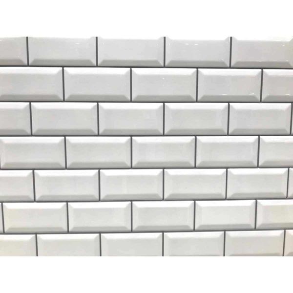 Reco Metro bevelled wall panel featuring a traditional stretcher brick bond pattern with a high-gloss white finish tile and dark grey ÔgroutŐ.